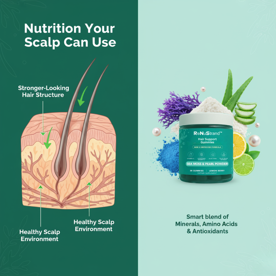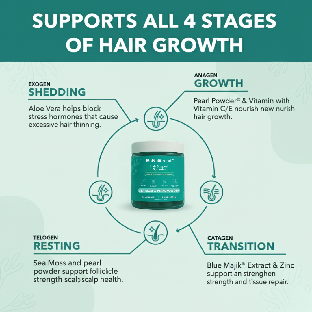 Rapid weight loss and reduced appetite can trigger temporary shedding (telogen effluvium). ReNuStrand™ pairs nutrient replenishment with hair-cycle support to help bring hair back to its normal rhythm—hello baby hairs.