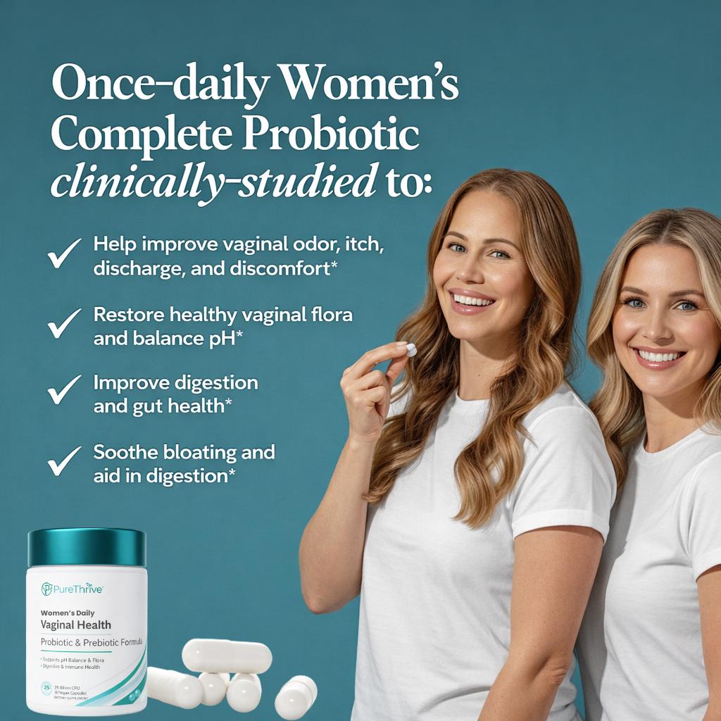 Support daily vaginal balance, digestive comfort, and feminine confidence with PureThrive’s advanced probiotic + prebiotic formula. Designed with clinically studied strains to help women feel fresh, comfortable, and in control naturally.